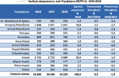 Ο αριθμός τους ήταν μειωμένος κατά 200, καθώς τον περασμένο χρόνο, λειτουργούσαν στο σύνολο της επικράτειας 10.220 φαρμακεία, έναντι 10.420 το 2017 και 10.386 το 2016.