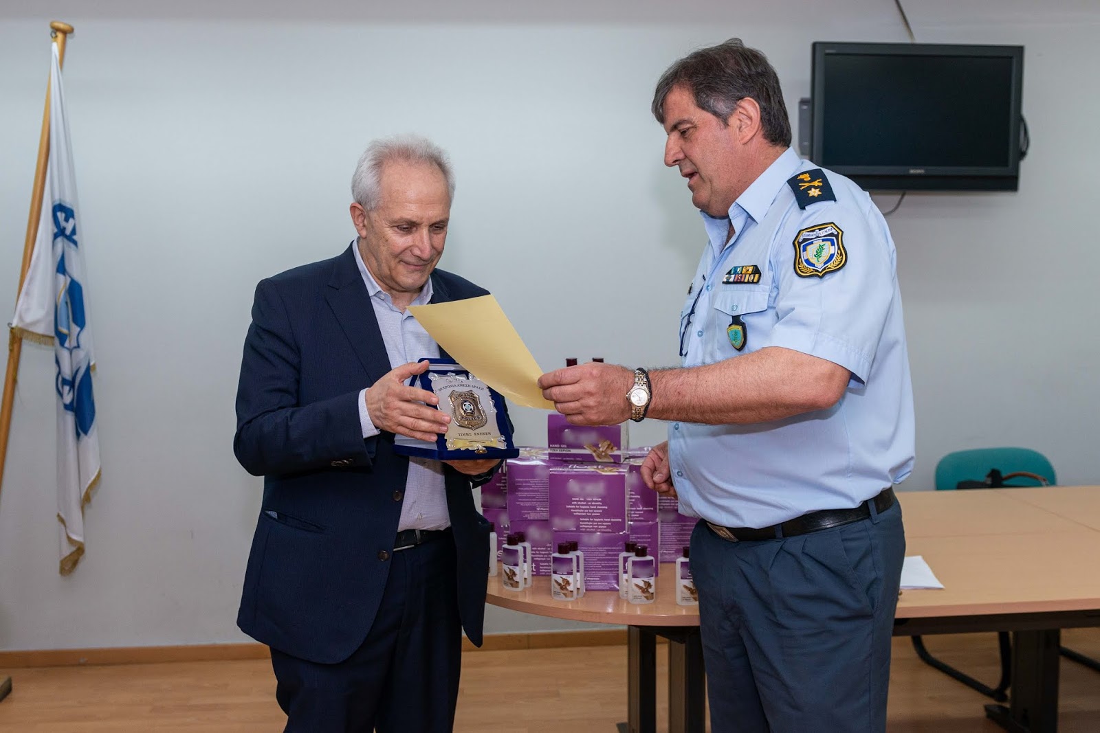 Ο Διευθυντής της Άμεσης Δράσης ταξίαρχος Κωνσταντίνος Κουτσιβίτης ευχαρίστησε για την δωρεά και παρέδωσε στον πρόεδρο του Πανελληνίου Φαρμακευτικού Συλλόγου κ. Απόστολο Βαλτά , τιμητική πλακέτα.
