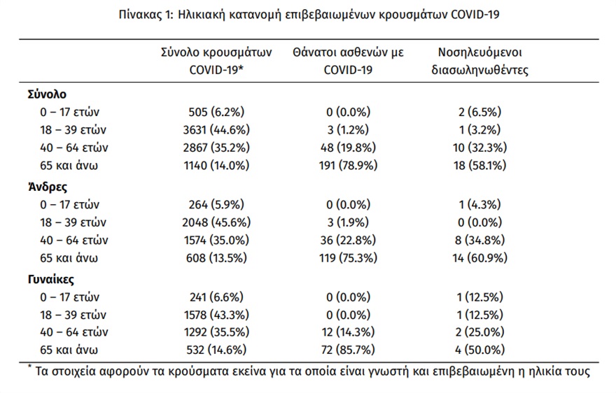 Τέλος, έχουμε 2 ακόμα καταγεγραμμένους θανάτους και 242 θανάτους συνολικά στη χώρα. 84 (34.7%) γυναίκες και οι υπόλοιποι άνδρες. Η διάμεση ηλικία των θανόντων συμπολιτών μας ήταν τα 77 έτη και το 94.6% είχε κάποιο υποκείμενο νόσημα ή/και ηλικία 70 ετών και άνω.
