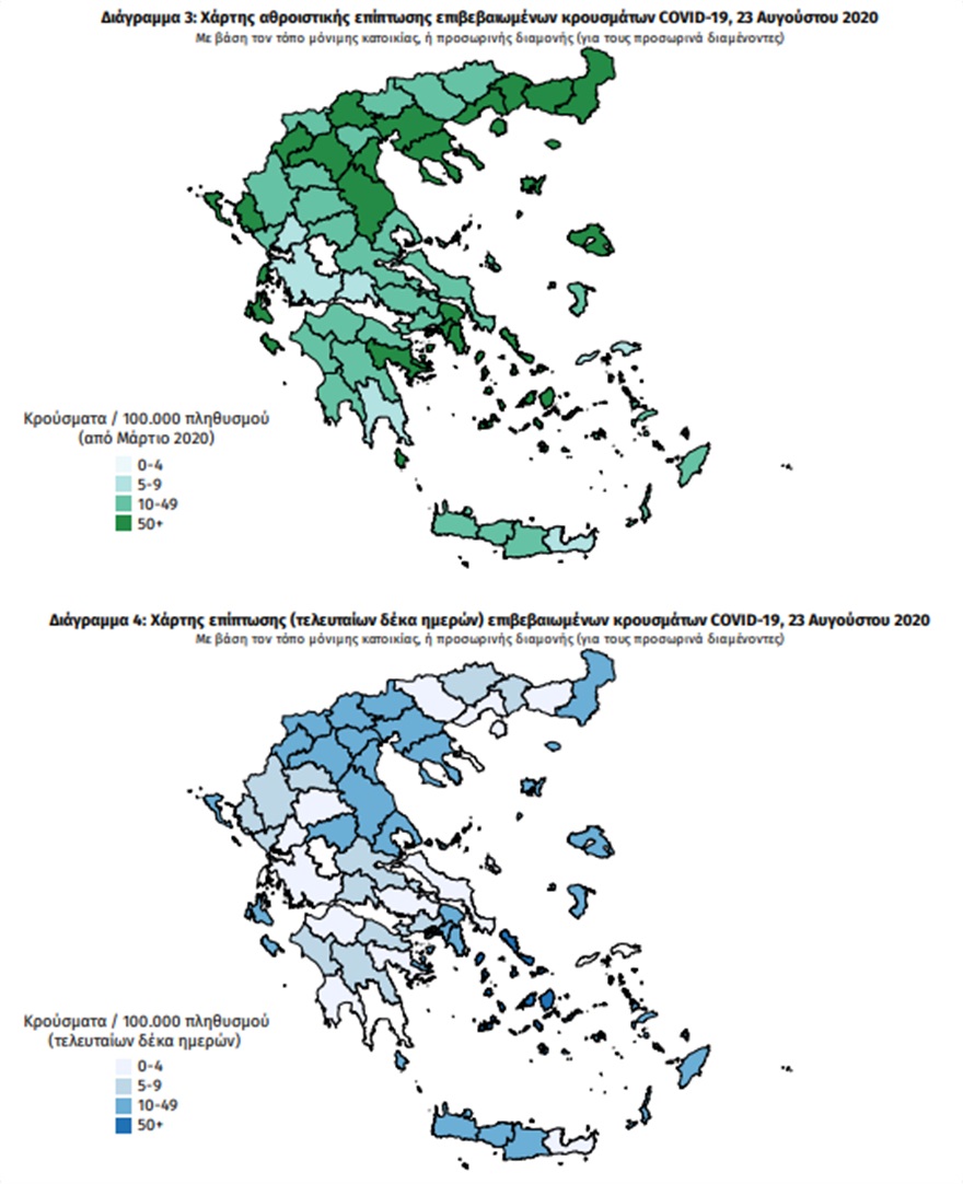 – 141 κρούσματα στην την Π.Ε. Αττικής, εκ των οποίων τα 26 συνδέονται με πρόσφατο ταξίδι στο εσωτερικό της χώρας και 15 συνδέονται με γνωστή συρροή